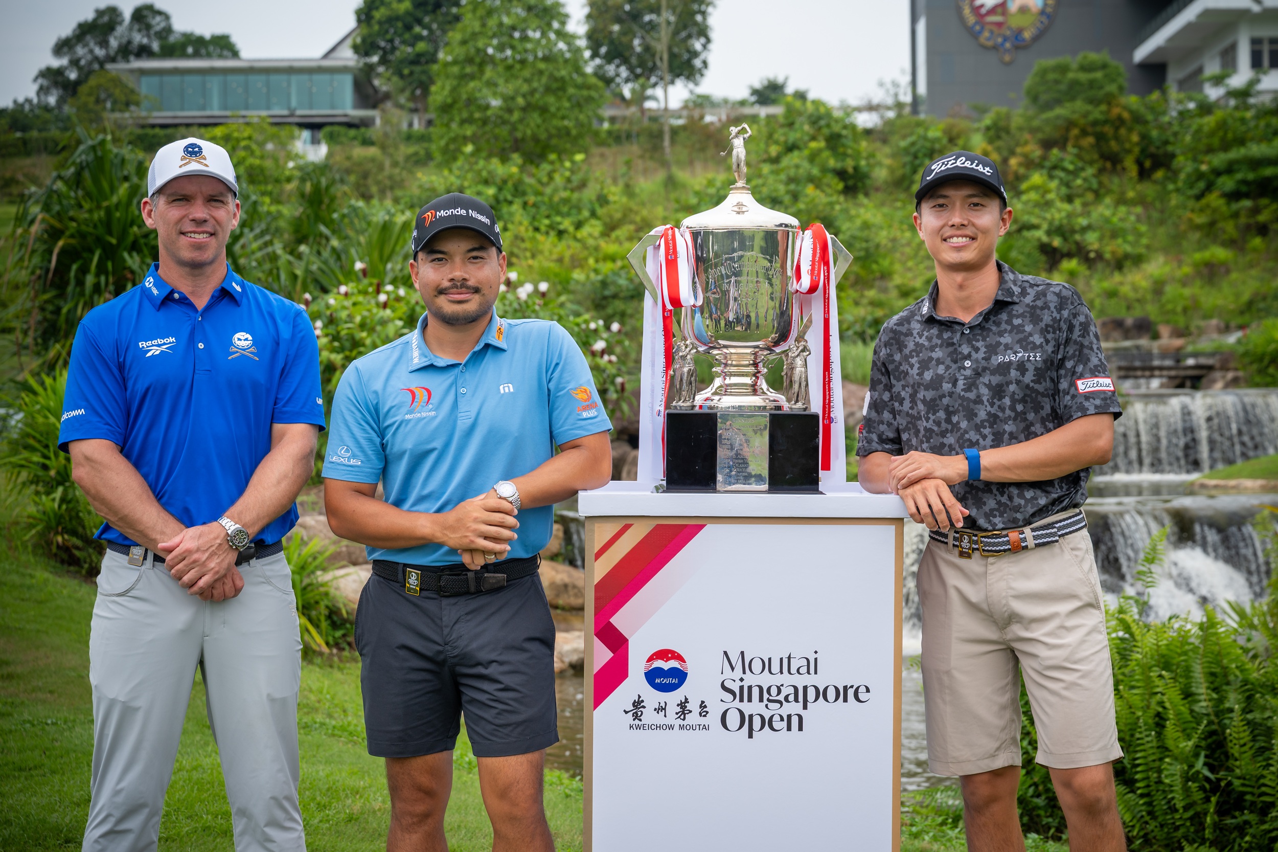 ตัวแทนนักกอล์ฟชั้นนำ (จากซ้าย) พอล เคซีย์ แชมป์พีจีเอทัวร์ 3 รายการจากอังกฤษ, มิเกล ทาบัวนา แชมป์อินเตอร์เนชันแนล ซีรีส์ ฟิลิปปินส์ และเจมส์ เหลียว นักกอล์ฟดาวรุ่งชาวสิงคโปร์ ร่วมถ่ายภาพประชาสัมพันธ์การแข่งขันกอล์ฟอินเตอร์เนชั่นเนล ซีรีส์ รายการ เหมาไถ สิงคโปร์ โอเพ่น ณ สนามสิงคโปร์ ไอแลนด์ คันทรี คลับ เมื่อวันที่ 5 พฤศจิกายนที่ผ่านมา (ภาพ: Asian Tour)