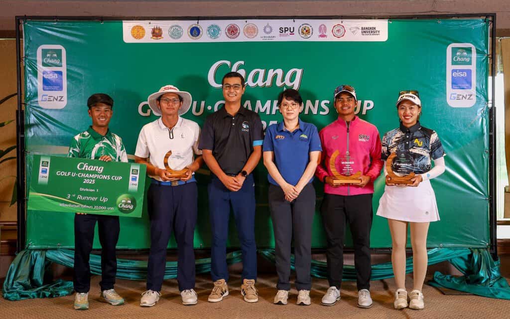 “ช้าง กอล์ฟ ยู-แชมเปี้ยน คัพ 2025” คุณดาว์ปกรณ์ รัตนสุวรรณ (ที่ 3 จากซ้าย) ประธานกรรมการบริหาร เดอะ เจ็นซ์ และคุณเพชรา ชัยชนะเลิศ ผู้จัดการฝ่ายโรงแรม สนามเลควิว รีสอร์ท แอนด์ กอล์ฟ คลับ (ที่ 3 จากขวา) ร่วมแสดงความยินดีกับนักกอล์ฟที่เข้าร่วมการแข่งขัน “ช้าง กอล์ฟ ยู-แชมเปี้ยนส์ คัพ 2025” รอบชิงชนะเลิศ ที่สนามเลควิว รีสอร์ท แอนด์ กอล์ฟ คลับ จ.เพชรบุรี เมื่อวันที่ 7 ก.ย.68